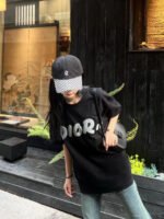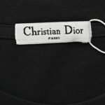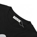 This Dior t-shirt features a bold oversized Dior logo in white on the front. The shirt is primarily black. offering a relaxed fit with short sleeves and a high neck. Perfect for adding a statement piece to your casual wardrobe while staying comfortable.